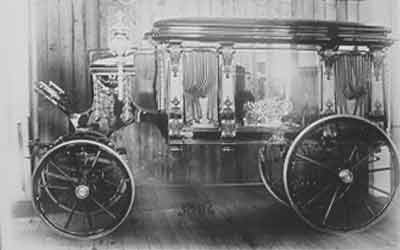 Cunningham’s Funeral Car dominated the industry until the close of the 19th century when smooth topped 6- and 8-column carved panel hearses replaced it. Not one to rest on their laurels, Cunningham’s catalogs soon offered all of the new popular styles as well as a complete line of carriages, ambulances, invalid wagons, casket wagons, embalmer’s carts and pallbearers' coaches. The 1882 move to incorporate was a timely one as James Cunningham joined the silent majority on May 15, 1886. He was 71. The official cause of death was blood poisoning, which was thought to be a direct result of a crippling injury incurred at the plant in March of 1884. His survivors included Mrs. Charles H. Wilkin, Mrs. R. K. Dryer, Joseph Thomas Cunningham, and Charles E. Cunningham. His wife Bridget preceded him in death and he was borne to his grave in a Cunningham hearse. When notified of his passing, the Hub remarked: