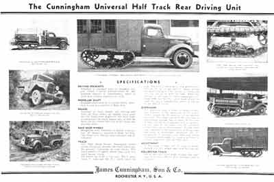 The 4-page flyer included pictures of Cunningham-equipped 1934-1937 Ford trucks with oil field, stake and airport service bodies. Also pictured was a track-equipped stake truck with skid skis replacing its front tires. Specifications were as follows: